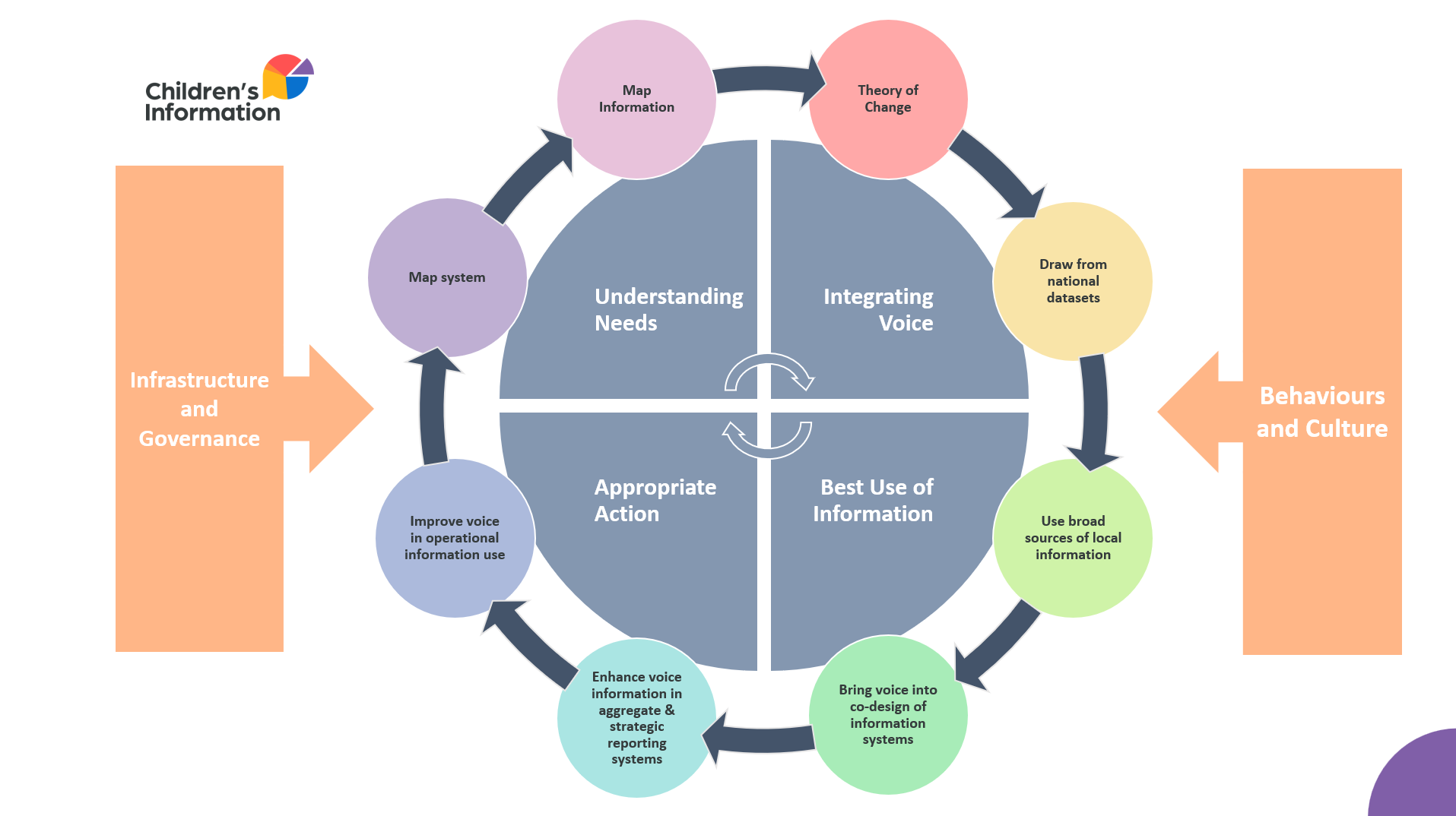 The Children's Information Project is developing a common ‘framework for effective information use’ that incorporates key design features and practices which have been identified in the relevant literature and through intensive fieldwork as essential dimensions of effective information use. The framework is in development and may be subject to change, however, it offers a helpful structure to consider integrating voice into system design and transformation.